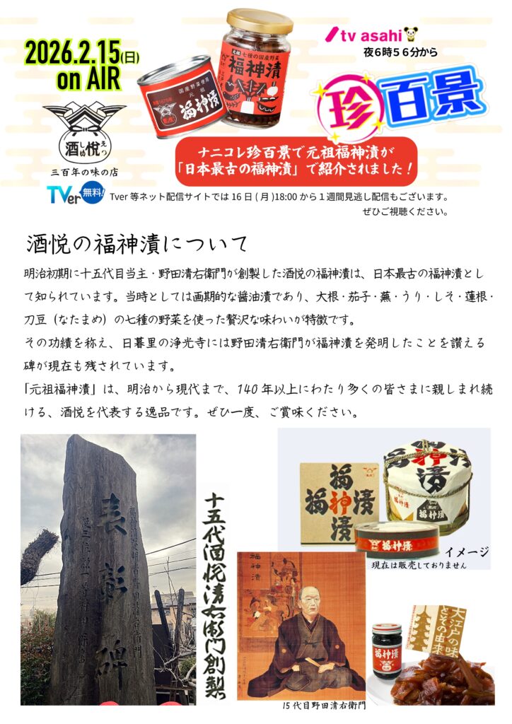 2月15日に放送された「テレビ朝日 ナニコレ珍百景」にて、酒悦の「元祖福神漬」が “日本最古の福神漬” として紹介されました。
