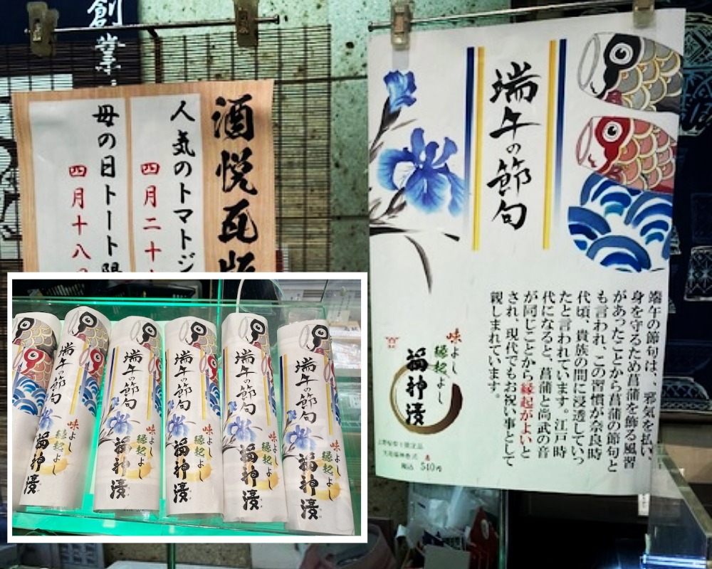 鯉のぼりや菖蒲の花をあしらった、今の季節ならではの彩り豊かな包装で展開しております。