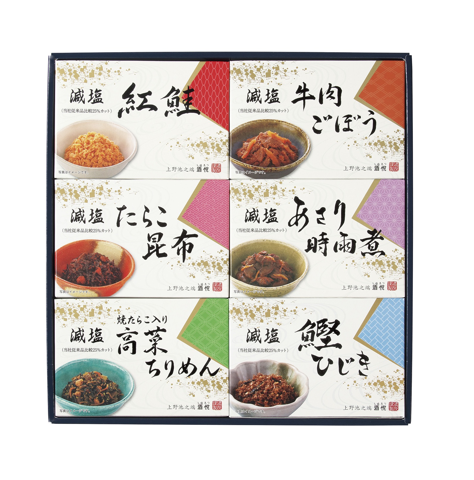 - 減塩(紅鮭 60g、鰹ひじき 35g、牛肉ごぼう 65g、あさり時雨煮 60g、たらこ昆布 60g、焼きたらこ入り高菜ちりめん 60g)