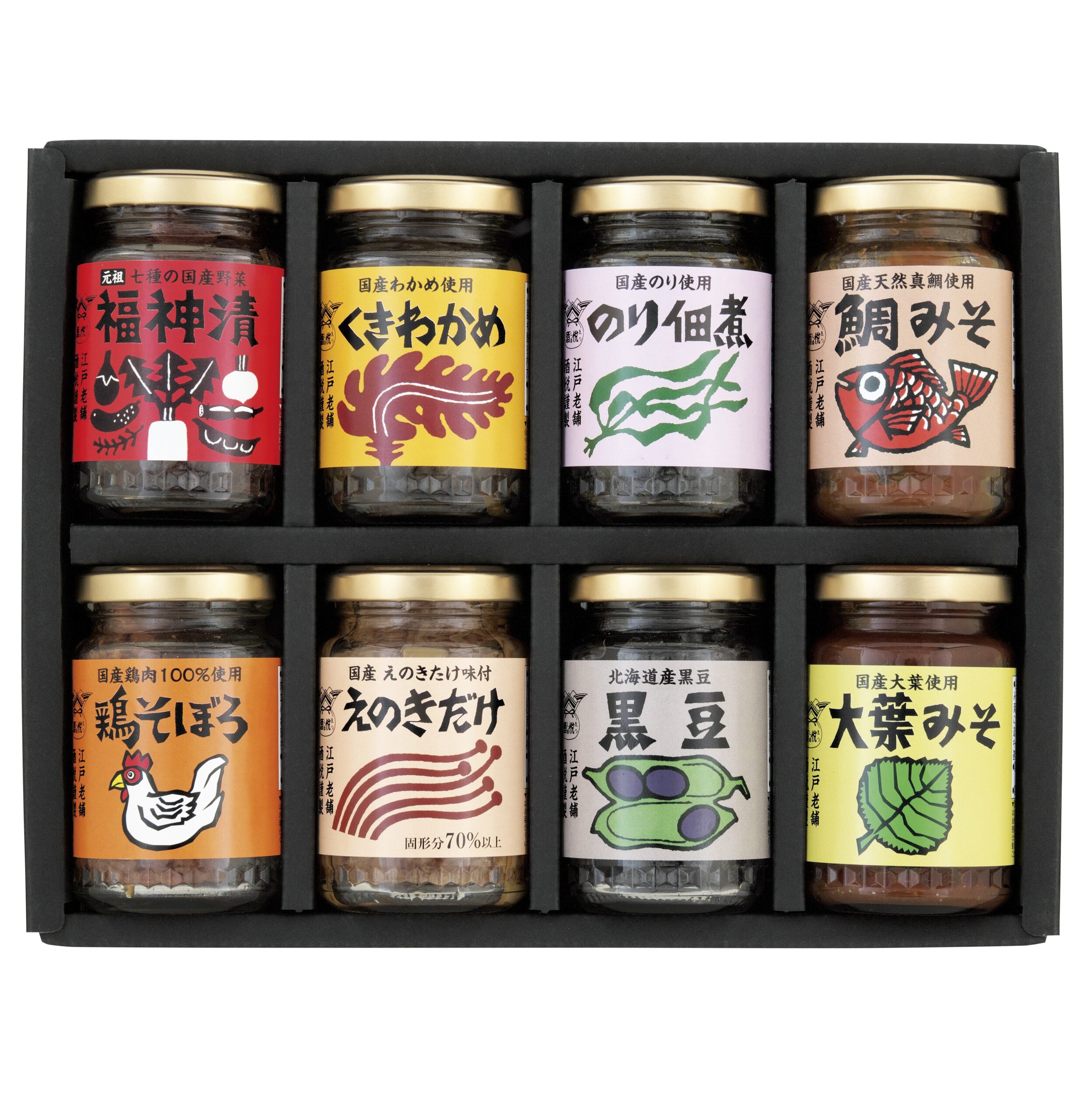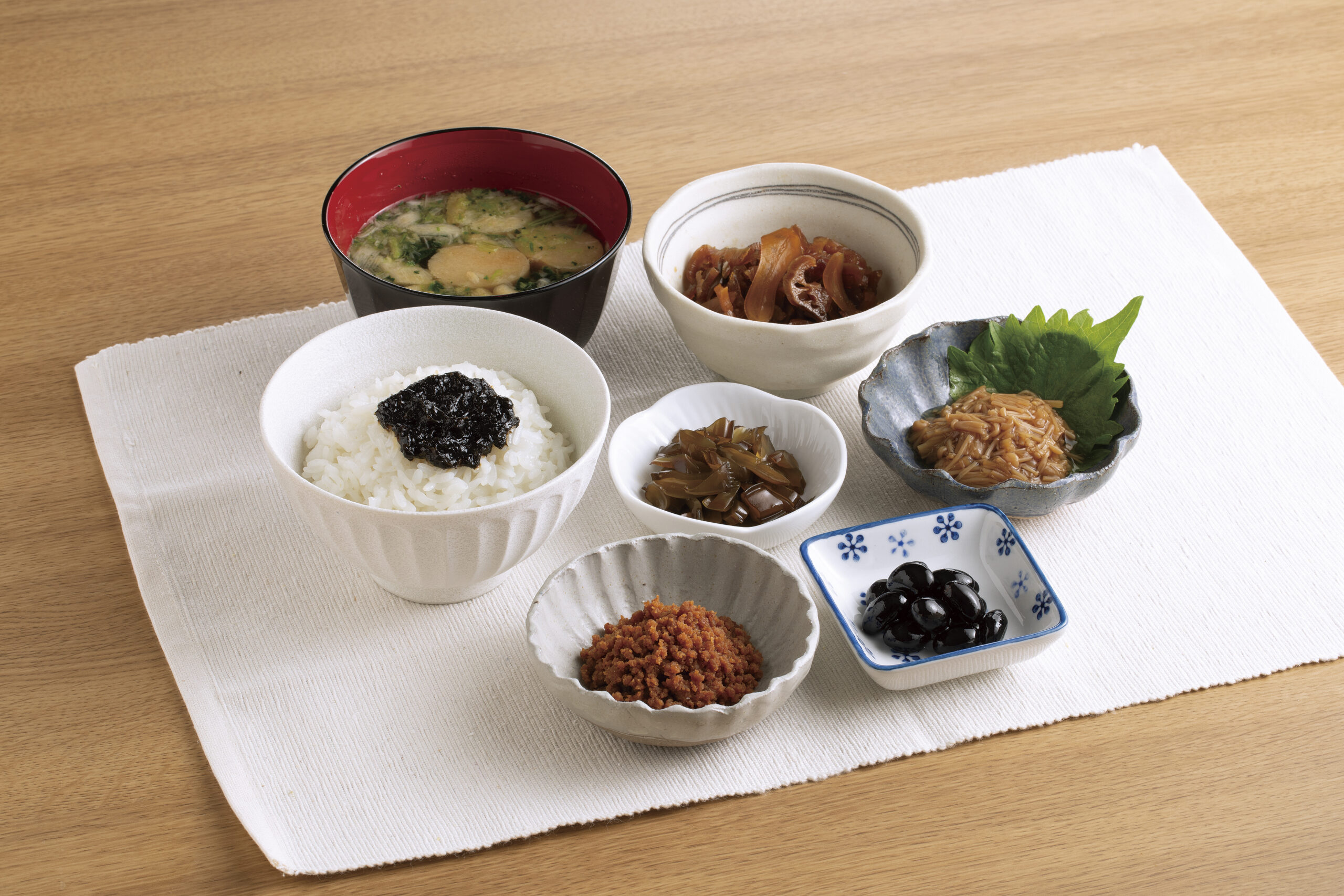 - 福神漬 90g、くきわかめ 75g、のり佃煮 95g、鯛みそ 100g、鶏そぼろ 50g、えのきだけ 90g、黒豆 100g、大葉みそ 100g