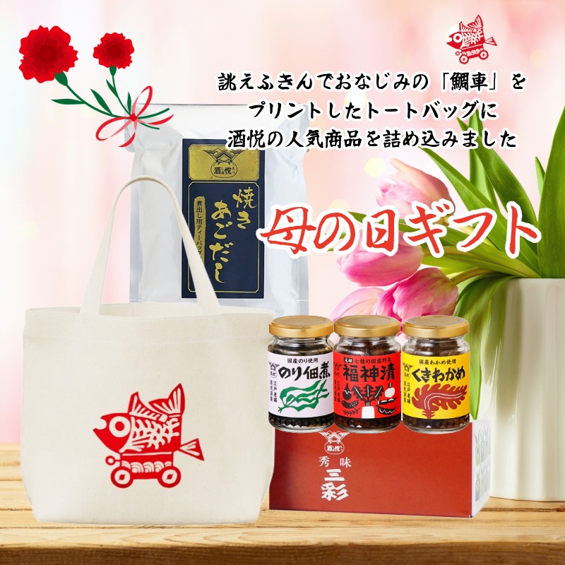 酒悦らしい縁起の良い絵柄「鯛車(たいぐるま)」をあしらったオリジナルトートバッグに、本店舗でご好評をいただいている「焼きあごだし」、酒悦元祖のご飯のお供・三彩セット(福神漬・のり佃煮・くきわかめ)を詰め合わせたセットです。