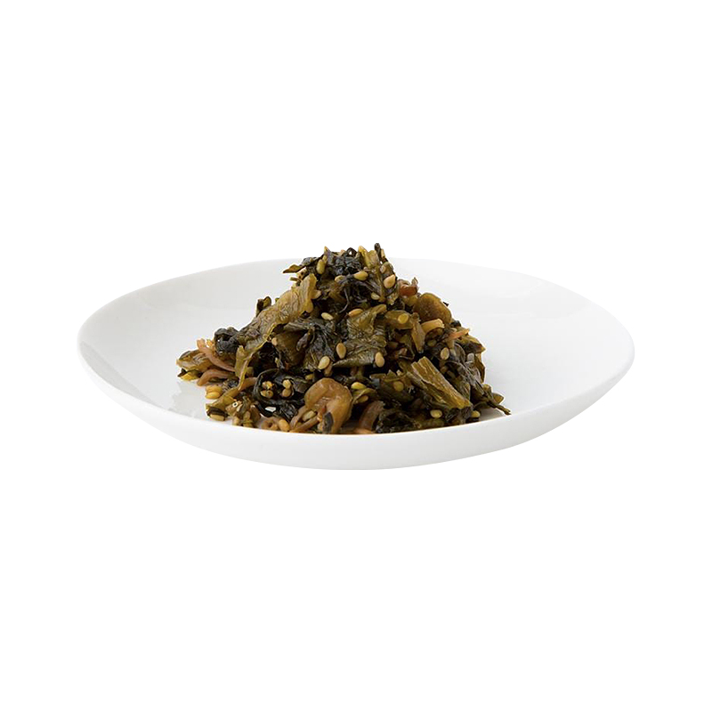 高菜、砂糖、ちりめん、ごま、醤油、食塩、オイスターソース、醸造酢、魚醤 / 調味料(アミノ酸等)、酸味料、カラメル色素、(一部に小麦・ごま・大豆を含む)