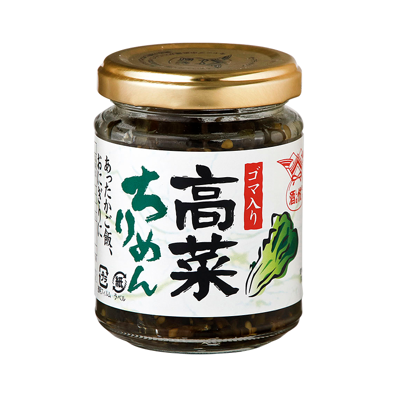 高菜、砂糖、醤油、食塩、まだら卵、ちりめん、ごま、オイスターソース、醸造酢、寒天、魚醤/調味料(アミノ酸等)、酸味料、酒精、カラメル色素、増粘多糖類、(一部に小麦・ごま・大豆を含む)