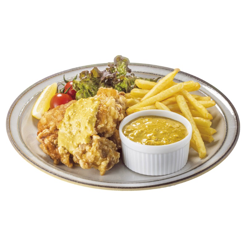 半固体状ドレッシング(国内製造)(食用植物油脂、糖類(水あめ、砂糖)、醸造酢、その他)、だいこん、らっきょう、果糖ぶどう糖液糖、レモン果汁、醤油、おろしにんにく、とうもろこし加工品、カレー粉、食塩、香辛料、酵母エキス、ぶどう糖/増粘剤(加工デンプン、増粘多糖類)、香料、(一部に小麦・大豆を含む)
