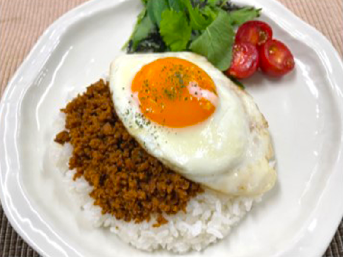 ドライカレー レシピに使える商品 鶏そぼろ カレー味 ※どの商品でも美味しく作ることができます。 材料(1人前) 鶏そぼろ カレー味 40g ごはん 200g 卵 1個 サラダ油 大さじ1/2 作り方 サラダ油を熱したフライパンに卵を入れ、弱めの中火で3分程焼きます。 お皿にご飯をのせ、その上にカレー鶏そぼろを盛り、目玉焼きをのせたら完成です。 #たまご#ごはん