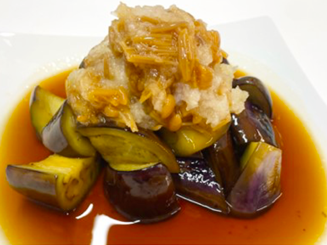- 大根おろしと本品(えのきだけ)を混ぜ合わせ、茄子の上へのせたら完成です。