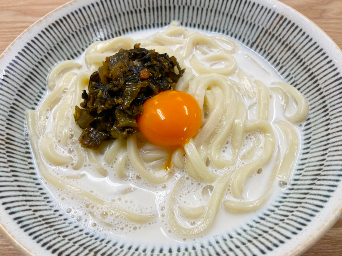 - 器に②を盛付け、高菜めんたいと卵黄をのせたら完成です。